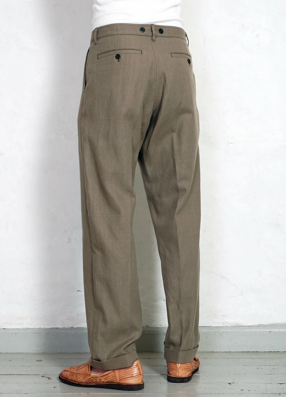 SUNE is loosely fitted trouser with wide cut legs, pleats, suspender buttons, folded cuffs and a rubber grip waistband.