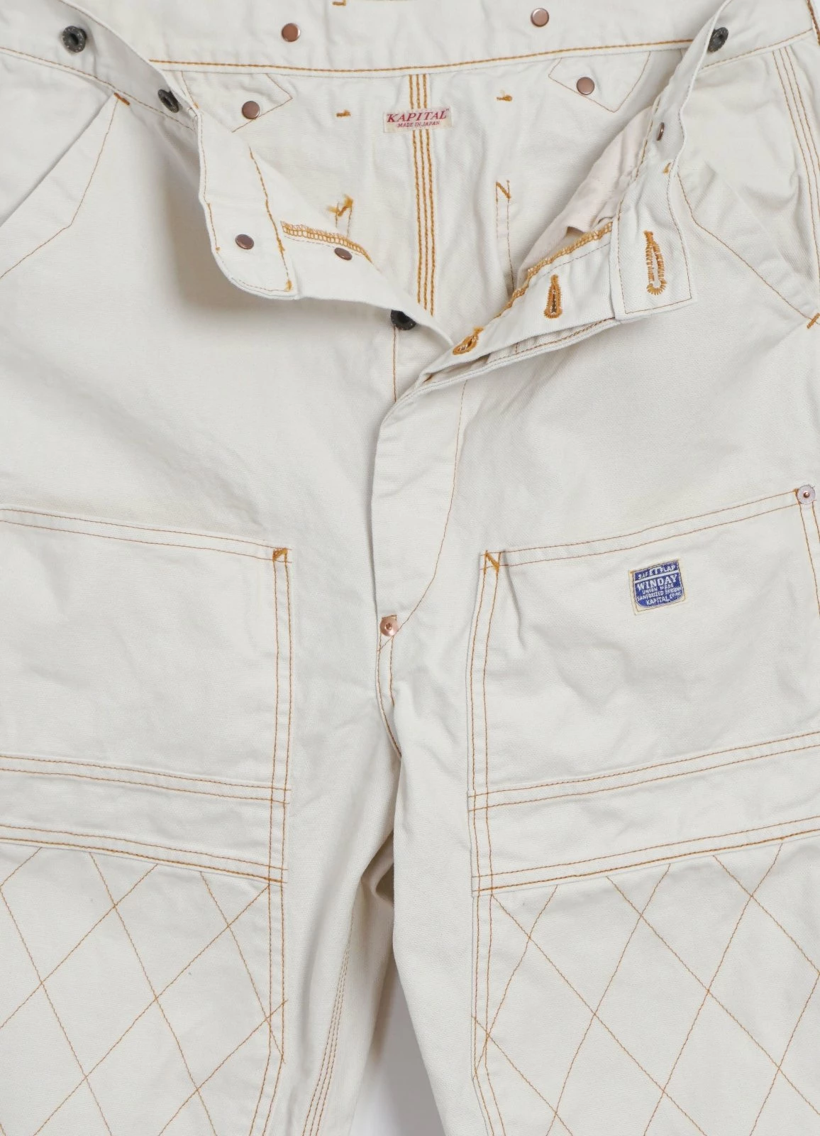 Workwear inspired trousers made from a thin canvas with contrast stitching. Inspired by overalls worn by lumberjacks, this trouser is durable and easy to wear as an everyday trouser. Also features cut front pads, metal buttons and various pockets in the front, side and back.